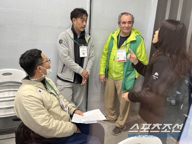 장성원 국가대표 감독 등 한국 코칭스태프가 주최측의 미숙한 운영에 항의하는 모습. 사진제공=대한장애인체육회 |